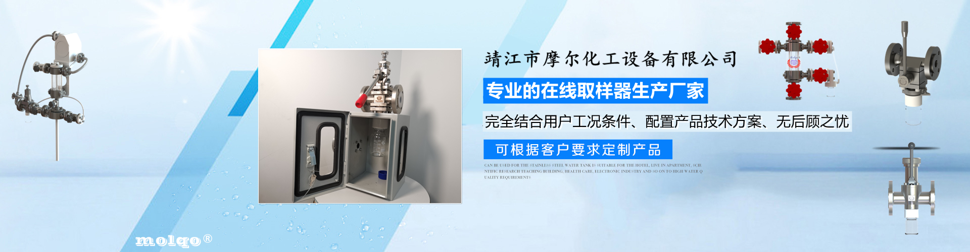 靖江市摩爾化工設(shè)備有限公司位于蘇中明珠——江蘇省靖江市城南工業(yè)園區(qū)東進路北側(cè)天元艾爾瑞內(nèi),另有生產(chǎn)基地位于靖江市經(jīng)濟技術(shù)開發(fā)區(qū)新號路1號鼎電科技園內(nèi)。我公司由數(shù)名長期從事化工生產(chǎn)、氟塑襯里模具開發(fā)以及機械自控設(shè)備的專業(yè)人員共同合作成立,致力于提供客戶最優(yōu)的高效在線取樣、反應(yīng)及精餾分離設(shè)備,為客戶提供合理的設(shè)備選型方案,以幫助客戶提高綜合生產(chǎn)效率以及改善生產(chǎn)現(xiàn)場環(huán)境為目標。 本公司主要制造及銷售的產(chǎn)品有:釜用在線取樣裝置,管道取樣閥,釜用清洗噴淋裝置、搪玻璃設(shè)備、GMP專用搪玻璃設(shè)備、氟塑襯里設(shè)備、攪拌器、釜用機械密封、氣動閥門及搪玻璃管道、襯氟閥門管道、非標不銹鋼容器,精餾塔塔器、片式冷凝器及PTFE密封件、鋯、鈦、鉭、鎳等加工件制品。我司是一家集研發(fā)銷售、設(shè)計咨詢服務(wù)于一體的專業(yè)···